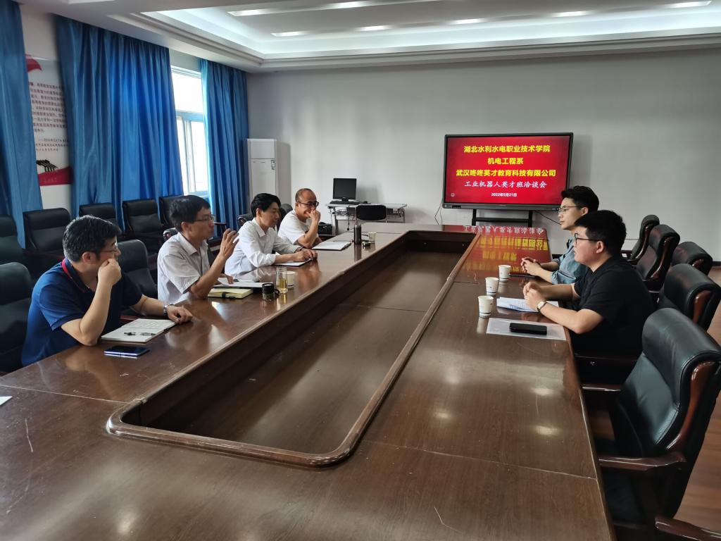 郝玉龙)5月21日,我院机电工程系在南湖校区机电楼会议室召开“工业机器人英才班”订单培养洽谈会,武汉咚咚英才教育科技有限公司、机电工程系负责人及工业机器人专业负责人参加洽谈。