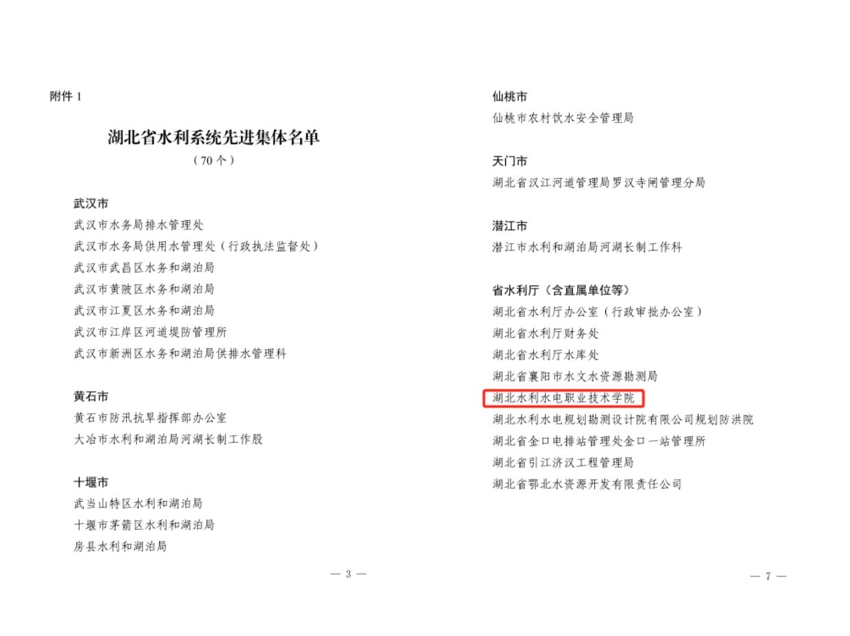 近日,湖北省人力资源和社会保障厅、省水利厅联合发布表彰决定,授予湖北水利水电职业技术学院“湖北省水利系统先进集体”荣誉称号。